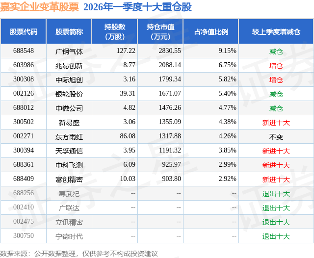 从基金规模来看,嘉实企业变革股票基金2026年一季度公布的基金规模为3.09亿元,较上一期规模3.06亿元变化了381.46万元,环比变化了1.25%。该基金最新一期资产配置为:股票占净值比90.86%,无债券类资产,现金占净值比9.36%。从基金持仓来看,该基金当季前十大股票仓位达50.29%,第一大重仓股为广钢气体(688548),持仓占比为9.15%。