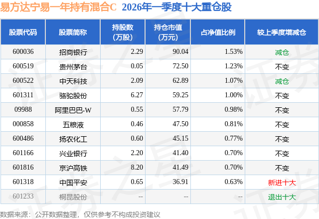 证券之星消息,日前易方达宁易一年持有混合C基金公布一季报,2026年一季度最新规模0.08亿元,季度净值涨幅为0.14%。
