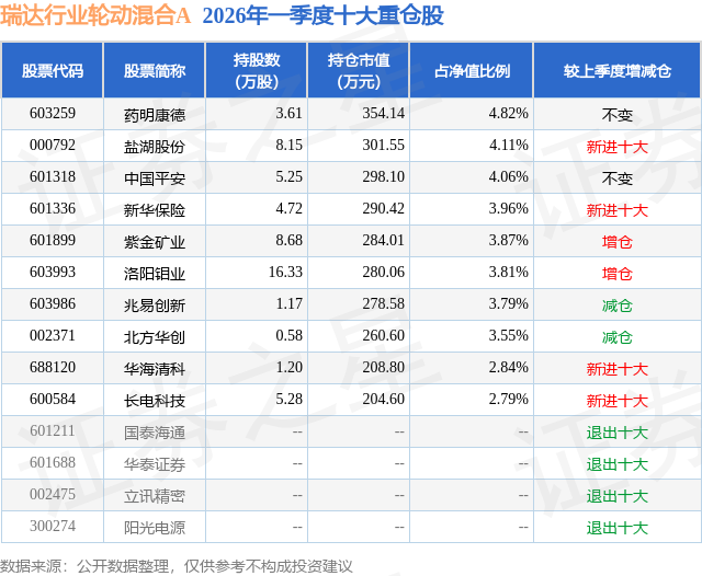 从基金规模来看,瑞达行业轮动混合A基金2026年一季度公布的基金规模为0.51亿元,较上一期规模4876.01万元变化了260.26万元,环比变化了5.34%。该基金最新一期资产配置为:股票占净值比72.68%,无债券类资产,现金占净值比27.63%。从基金持仓来看,该基金当季前十大股票仓位达37.6%,第一大重仓股为药明康德(603259),持仓占比为4.82%。