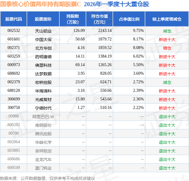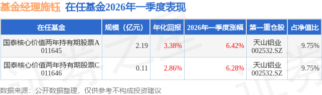从基金规模来看,国泰核心价值两年持有期股票C基金2026年一季度公布的基金规模为0.11亿元,较上一期规模1071.76万元变化了29.98万元,环比变化了2.8%。该基金最新一期资产配置为:股票占净值比90.34%,债券占净值比6.2%,现金占净值比2.1%。从基金持仓来看,该基金当季前十大股票仓位达50.81%,第一大重仓股为天山铝业(002532),持仓占比为9.75%。