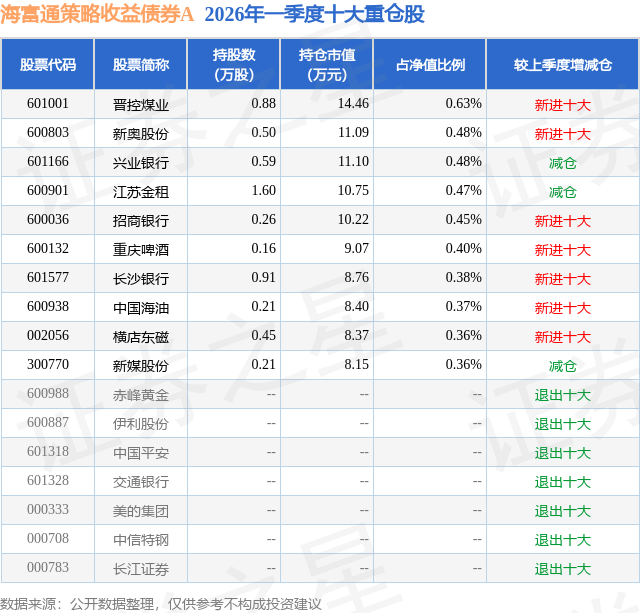 从基金规模来看,海富通策略收益债券A基金2026年一季度公布的基金规模为0.21亿元,较上一期规模5588.14万元变化了-3440.78万元,环比变化了-61.57%。该基金最新一期资产配置为:股票占净值比12.7%,债券占净值比86.55%,现金占净值比0.78%。从基金持仓来看,该基金当季前十大股票仓位达4.38%,第一大重仓股为晋控煤业(601001),持仓占比为0.63%。