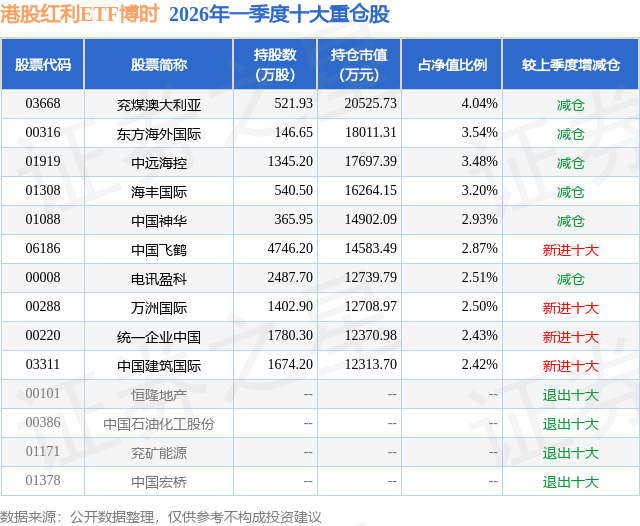 从基金规模来看,港股红利ETF博时基金2026年一季度公布的基金规模为50.86亿元,较上一期规模55.26亿元变化了-4.4亿元,环比变化了-7.97%。该基金最新一期资产配置为:股票占净值比99.3%,无债券类资产,现金占净值比2.04%。从基金持仓来看,该基金当季前十大股票仓位达29.92%,第一大重仓股为兖煤澳大利亚(03668),持仓占比为4.04%。