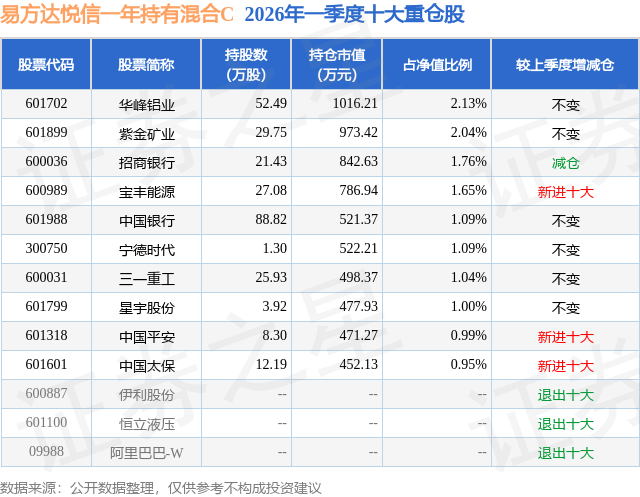 从基金规模来看,易方达悦信一年持有混合C基金2026年一季度公布的基金规模为1.01亿元,较上一期规模2.08亿元变化了-1.07亿元,环比变化了-51.58%。该基金最新一期资产配置为:股票占净值比23.35%,债券占净值比94.2%,现金占净值比1.27%。从基金持仓来看,该基金当季前十大股票仓位达13.74%,第一大重仓股为华峰铝业(601702),持仓占比为2.13%。