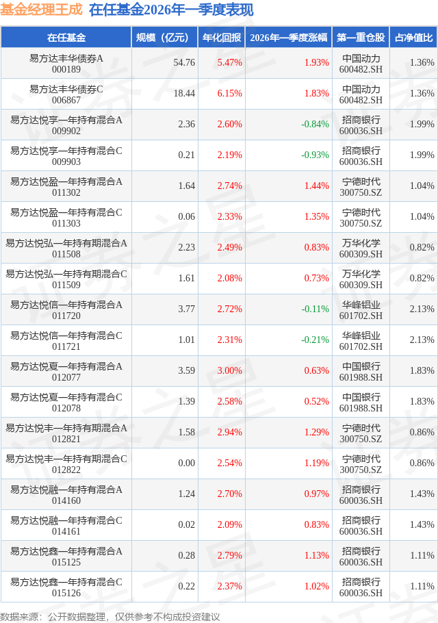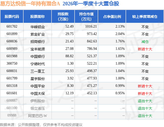 从基金规模来看,易方达悦信一年持有混合A基金2026年一季度公布的基金规模为3.77亿元,较上一期规模6.78亿元变化了-3.01亿元,环比变化了-44.37%。该基金最新一期资产配置为:股票占净值比23.35%,债券占净值比94.2%,现金占净值比1.27%。从基金持仓来看,该基金当季前十大股票仓位达13.74%,第一大重仓股为华峰铝业(601702),持仓占比为2.13%。