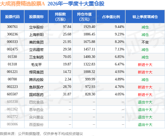 从基金规模来看,大成消费精选股票A基金2026年一季度公布的基金规模为1.96亿元,较上一期规模2.28亿元变化了-3155.53万元,环比变化了-13.86%。该基金最新一期资产配置为:股票占净值比91.01%,无债券类资产,现金占净值比8.5%。从基金持仓来看,该基金当季前十大股票仓位达65.95%,第一大重仓股为立华股份(300761),持仓占比为9.44%。