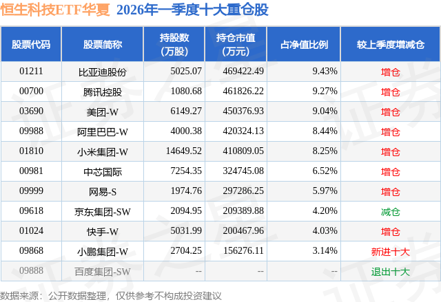 从基金规模来看,恒生科技ETF华夏基金2026年一季度公布的基金规模为497.97亿元,较上一期规模489.48亿元变化了8.49亿元,环比变化了1.73%。该基金最新一期资产配置为:股票占净值比96.8%,无债券类资产,现金占净值比2.79%。从基金持仓来看,该基金当季前十大股票仓位达68.29%,第一大重仓股为比亚迪股份(01211),持仓占比为9.43%。