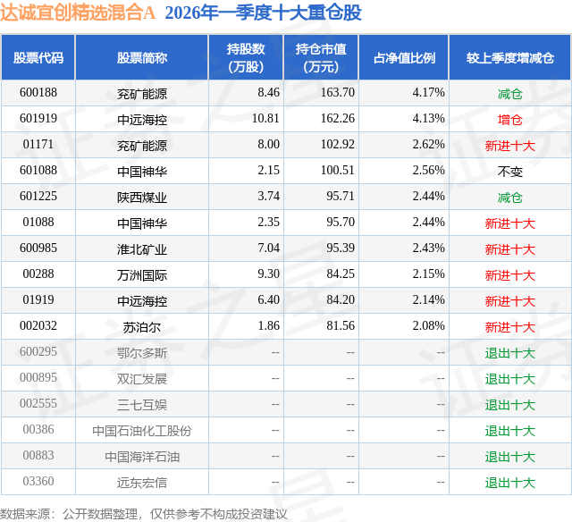 从基金规模来看,达诚宜创精选混合A基金2026年一季度公布的基金规模为0.31亿元,较上一期规模4135.09万元变化了-1077.87万元,环比变化了-26.07%。该基金最新一期资产配置为:股票占净值比89.99%,无债券类资产,现金占净值比10.33%。从基金持仓来看,该基金当季前十大股票仓位达27.16%,第一大重仓股为兖矿能源(600188),持仓占比为4.17%。