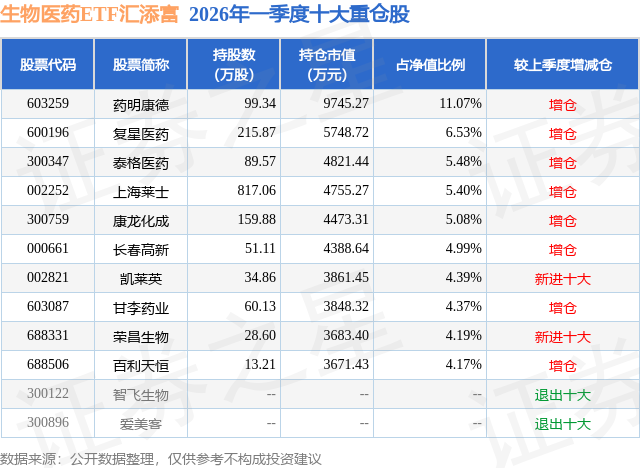 从基金规模来看,生物医药ETF汇添富基金2026年一季度公布的基金规模为8.8亿元,较上一期规模7.18亿元变化了1.62亿元,环比变化了22.63%。该基金最新一期资产配置为:股票占净值比99.35%,无债券类资产,现金占净值比1.44%。从基金持仓来看,该基金当季前十大股票仓位达55.67%,第一大重仓股为药明康德(603259),持仓占比为11.07%。