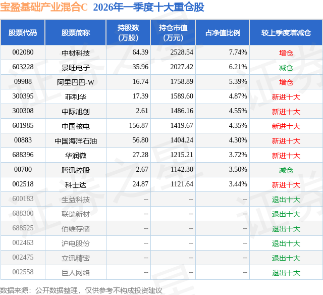 从基金规模来看,宝盈基础产业混合C基金2026年一季度公布的基金规模为0.39亿元,较上一期规模4841.66万元变化了-928.89万元,环比变化了-19.19%。该基金最新一期资产配置为:股票占净值比89.88%,无债券类资产,现金占净值比10.62%。从基金持仓来看,该基金当季前十大股票仓位达48.07%,第一大重仓股为中材科技(002080),持仓占比为7.74%。