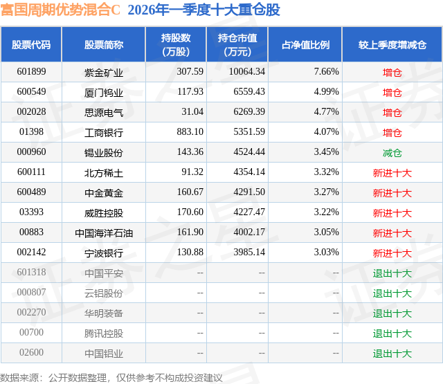 从基金规模来看,富国周期优势混合C基金2026年一季度公布的基金规模为4.12亿元,较上一期规模1.18亿元变化了2.94亿元,环比变化了249.95%。该基金最新一期资产配置为:股票占净值比89.04%,无债券类资产,现金占净值比12.14%。从基金持仓来看,该基金当季前十大股票仓位达40.83%,第一大重仓股为紫金矿业(601899),持仓占比为7.66%。
