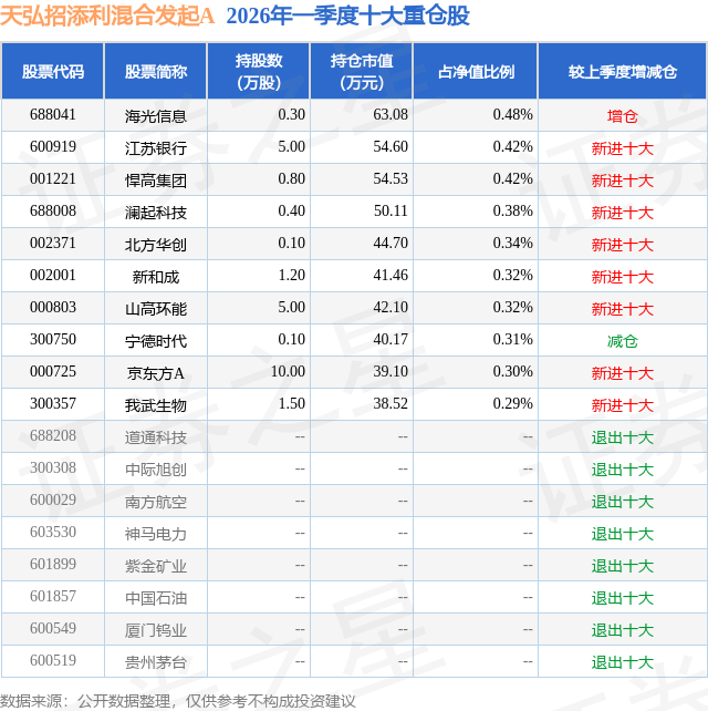 从基金规模来看,天弘招添利混合发起A基金2026年一季度公布的基金规模为0.18亿元,较上一期规模3095.3万元变化了-1266.68万元,环比变化了-40.92%。该基金最新一期资产配置为:股票占净值比6.91%,债券占净值比108.0%,现金占净值比2.08%。从基金持仓来看,该基金当季前十大股票仓位达3.58%,第一大重仓股为海光信息(688041),持仓占比为0.48%。