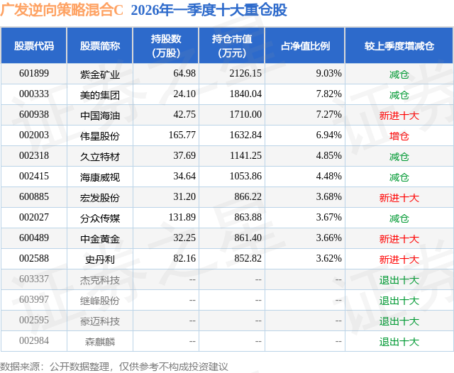 从基金规模来看,广发逆向策略混合C基金2026年一季度公布的基金规模为1.11亿元,较上一期规模1611.94万元变化了9488.28万元,环比变化了588.63%。该基金最新一期资产配置为:股票占净值比94.8%,无债券类资产,现金占净值比14.2%。从基金持仓来看,该基金当季前十大股票仓位达55.02%,第一大重仓股为紫金矿业(601899),持仓占比为9.03%。