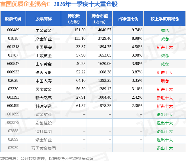 从基金规模来看,富国优质企业混合C基金2026年一季度公布的基金规模为0.23亿元,较上一期规模2834.84万元变化了-544.94万元,环比变化了-19.22%。该基金最新一期资产配置为:股票占净值比90.04%,债券占净值比1.41%,现金占净值比10.96%。从基金持仓来看,该基金当季前十大股票仓位达46.26%,第一大重仓股为中金黄金(600489),持仓占比为9.74%。