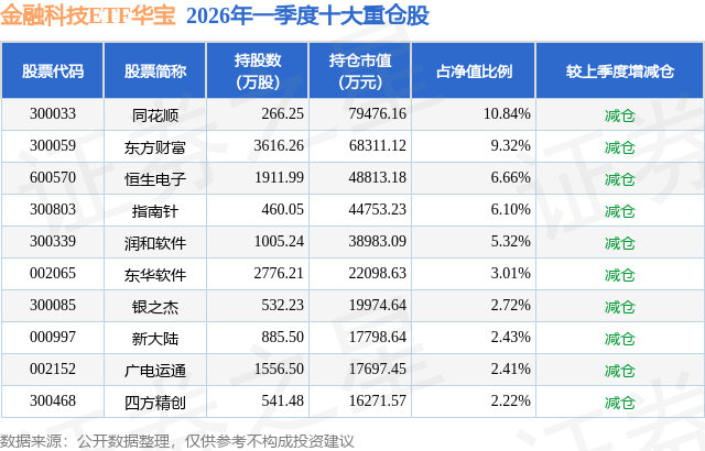 从基金规模来看,金融科技ETF华宝基金2026年一季度公布的基金规模为73.31亿元,较上一期规模100.84亿元变化了-27.53亿元,环比变化了-27.3%。该基金最新一期资产配置为:股票占净值比99.64%,无债券类资产,现金占净值比0.5%。从基金持仓来看,该基金当季前十大股票仓位达51.03%,第一大重仓股为同花顺(300033),持仓占比为10.84%。