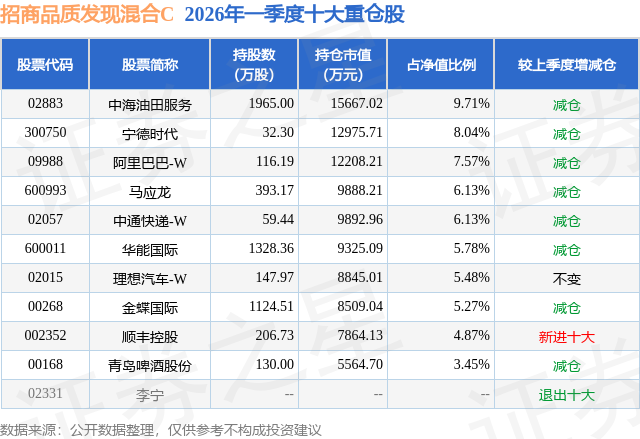 从基金规模来看,招商品质发现混合C基金2026年一季度公布的基金规模为3.99亿元,较上一期规模1.33亿元变化了2.66亿元,环比变化了200.02%。该基金最新一期资产配置为:股票占净值比94.88%,债券占净值比5.33%,现金占净值比1.38%。从基金持仓来看,该基金当季前十大股票仓位达62.43%,第一大重仓股为中海油田服务(02883),持仓占比为9.71%。