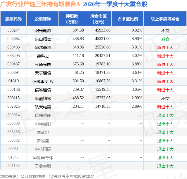 从基金规模来看,广发行业严选三年持有期混合A基金2026年一季度公布的基金规模为46.61亿元,较上一期规模61.81亿元变化了-15.2亿元,环比变化了-24.6%。该基金最新一期资产配置为:股票占净值比79.43%,无债券类资产,现金占净值比19.91%。从基金持仓来看,该基金当季前十大股票仓位达46.7%,第一大重仓股为阳光电源(300274),持仓占比为9.02%。