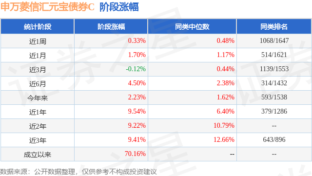 从业绩表现来看,申万菱信汇元宝债券C基金过去一年净值涨幅为9.54%,在同类基金中排名379/1286,同类基金过去一年净值涨幅中位数为6.4%。而基金过去一年的最大回撤为-4.41%,成立以来的最大回撤为-14.92%。