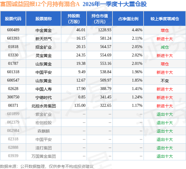 从基金规模来看,富国诚益回报12个月持有混合A基金2026年一季度公布的基金规模为1.75亿元,较上一期规模2.19亿元变化了-4312.23万元,环比变化了-19.73%。该基金最新一期资产配置为:股票占净值比39.15%,债券占净值比56.45%,现金占净值比3.03%。从基金持仓来看,该基金当季前十大股票仓位达20.28%,第一大重仓股为中金黄金(600489),持仓占比为4.46%。
