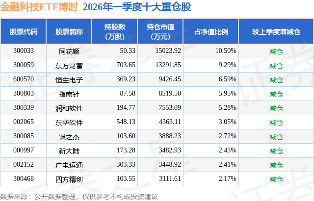 从基金规模来看,金融科技ETF博时基金2026年一季度公布的基金规模为14.31亿元,较上一期规模21.52亿元变化了-7.2亿元,环比变化了-33.48%。该基金最新一期资产配置为:股票占净值比98.64%,无债券类资产,现金占净值比1.54%。从基金持仓来看,该基金当季前十大股票仓位达50.39%,第一大重仓股为同花顺(300033),持仓占比为10.5%。