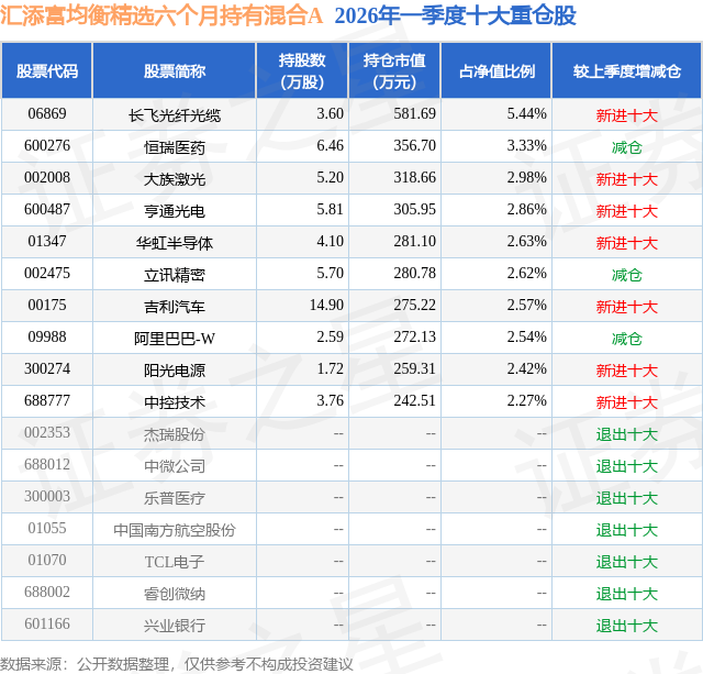 从基金规模来看,汇添富均衡精选六个月持有混合A基金2026年一季度公布的基金规模为1.02亿元,较上一期规模1.21亿元变化了-1955.24万元,环比变化了-16.15%。该基金最新一期资产配置为:股票占净值比92.69%,无债券类资产,现金占净值比7.79%。从基金持仓来看,该基金当季前十大股票仓位达29.66%,第一大重仓股为长飞光纤光缆(06869),持仓占比为5.44%。