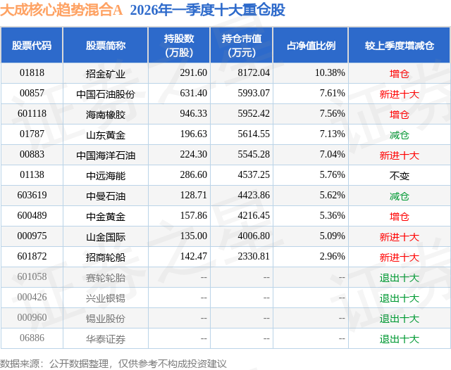 从基金规模来看,大成核心趋势混合A基金2026年一季度公布的基金规模为5.78亿元,较上一期规模5.6亿元变化了1845.46万元,环比变化了3.3%。该基金最新一期资产配置为:股票占净值比83.62%,无债券类资产,现金占净值比17.38%。从基金持仓来看,该基金当季前十大股票仓位达64.51%,第一大重仓股为招金矿业(01818),持仓占比为10.38%。