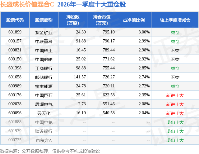 从基金规模来看,长盛成长价值混合C基金2026年一季度公布的基金规模为0.02亿元,较上一期规模9094.95万元变化了-8940.43万元,环比变化了-98.3%。该基金最新一期资产配置为:股票占净值比63.68%,债券占净值比21.71%,现金占净值比14.45%。从基金持仓来看,该基金当季前十大股票仓位达26.67%,第一大重仓股为紫金矿业(601899),持仓占比为3.0%。