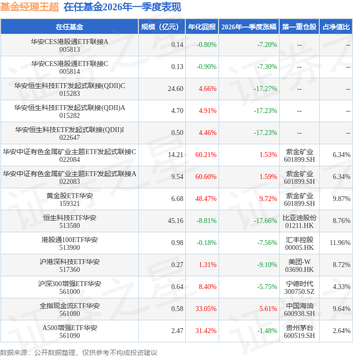 证券之星消息,日前沪港深科技ETF华安基金公布一季报,2026年一季度最新规模0.27亿元,季度净值涨幅为-9.1%。