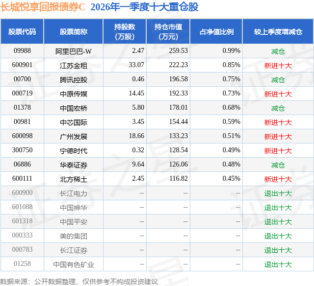 从基金规模来看,长城悦享回报债券C基金2026年一季度公布的基金规模为0.04亿元,较上一期规模483.51万元变化了-127.64万元,环比变化了-26.4%。该基金最新一期资产配置为:股票占净值比11.0%,债券占净值比81.46%,现金占净值比2.16%。从基金持仓来看,该基金当季前十大股票仓位达6.52%,第一大重仓股为阿里巴巴-W(09988),持仓占比为0.99%。
