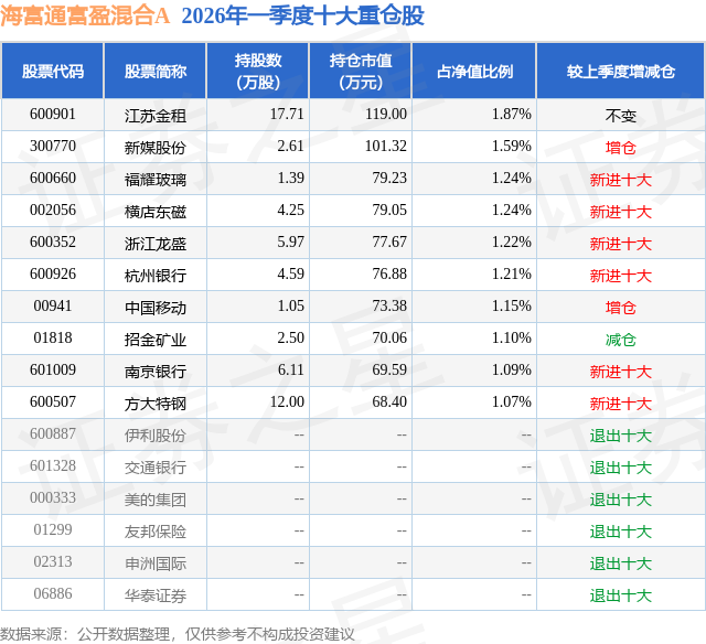 从基金规模来看,海富通富盈混合A基金2026年一季度公布的基金规模为0.33亿元,较上一期规模4547.86万元变化了-1198.81万元,环比变化了-26.36%。该基金最新一期资产配置为:股票占净值比33.14%,债券占净值比59.94%,现金占净值比4.27%。从基金持仓来看,该基金当季前十大股票仓位达12.78%,第一大重仓股为江苏金租(600901),持仓占比为1.87%。