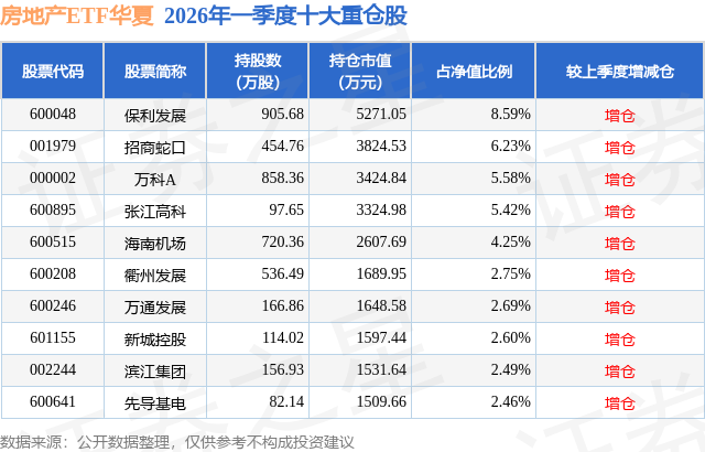 从基金规模来看,房地产ETF华夏基金2026年一季度公布的基金规模为6.14亿元,较上一期规模5.43亿元变化了7064.04万元,环比变化了13.0%。该基金最新一期资产配置为:股票占净值比99.8%,无债券类资产,现金占净值比0.86%。从基金持仓来看,该基金当季前十大股票仓位达43.06%,第一大重仓股为保利发展(600048),持仓占比为8.59%。