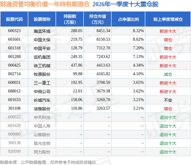 从基金规模来看,财通资管均衡价值一年持有期混合基金2026年一季度公布的基金规模为10.16亿元,较上一期规模10.72亿元变化了-5563.26万元,环比变化了-5.19%。该基金最新一期资产配置为:股票占净值比92.5%,无债券类资产,现金占净值比6.82%。从基金持仓来看,该基金当季前十大股票仓位达52.8%,第一大重仓股为瀚蓝环境(600323),持仓占比为8.32%。