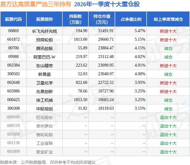从基金规模来看,易方达高质量严选三年持有基金2026年一季度公布的基金规模为57.54亿元,较上一期规模75.86亿元变化了-18.31亿元,环比变化了-24.14%。该基金最新一期资产配置为:股票占净值比90.74%,债券占净值比0.21%,现金占净值比13.42%。从基金持仓来看,该基金当季前十大股票仓位达40.4%,第一大重仓股为长飞光纤光缆(06869),持仓占比为5.47%。