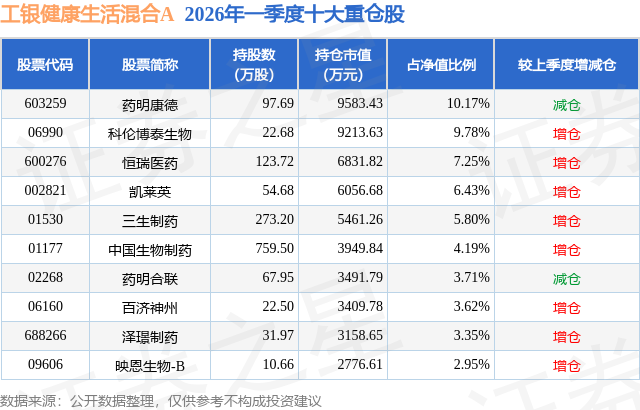 从基金规模来看,工银健康生活混合A基金2026年一季度公布的基金规模为7.96亿元,较上一期规模5.86亿元变化了2.1亿元,环比变化了35.91%。该基金最新一期资产配置为:股票占净值比92.06%,无债券类资产,现金占净值比8.9%。从基金持仓来看,该基金当季前十大股票仓位达57.25%,第一大重仓股为药明康德(603259),持仓占比为10.17%。