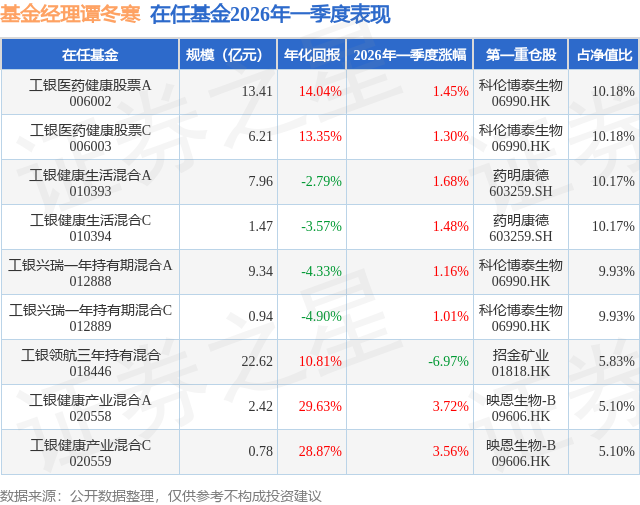 证券之星消息,日前工银健康生活混合A基金公布一季报,2026年一季度最新规模7.96亿元,季度净值涨幅为1.68%。