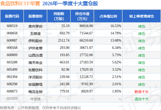 从基金规模来看,食品饮料ETF华夏基金2026年一季度公布的基金规模为48.4亿元,较上一期规模56.64亿元变化了-8.25亿元,环比变化了-14.56%。该基金最新一期资产配置为:股票占净值比99.81%,无债券类资产,现金占净值比0.25%。从基金持仓来看,该基金当季前十大股票仓位达72.57%,第一大重仓股为贵州茅台(600519),持仓占比为16.53%。