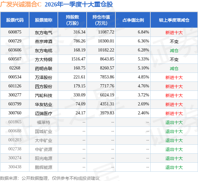 从基金规模来看,广发兴诚混合C基金2026年一季度公布的基金规模为8.9亿元,较上一期规模11.62亿元变化了-2.72亿元,环比变化了-23.4%。该基金最新一期资产配置为:股票占净值比72.0%,债券占净值比0.58%,现金占净值比27.71%。从基金持仓来看,该基金当季前十大股票仓位达48.39%,第一大重仓股为东方电气(600875),持仓占比为6.84%。