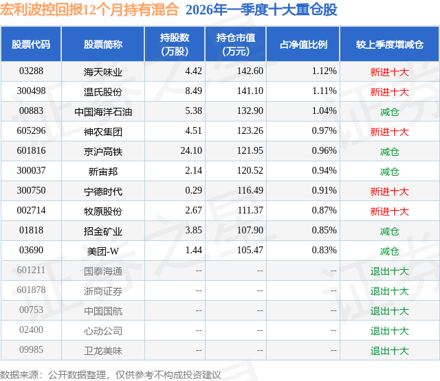 从基金规模来看,宏利波控回报12个月持有混合基金2026年一季度公布的基金规模为1.28亿元,较上一期规模3.37亿元变化了-2.09亿元,环比变化了-62.09%。该基金最新一期资产配置为:股票占净值比18.71%,债券占净值比89.95%,现金占净值比7.97%。从基金持仓来看,该基金当季前十大股票仓位达9.6%,第一大重仓股为海天味业(03288),持仓占比为1.12%。