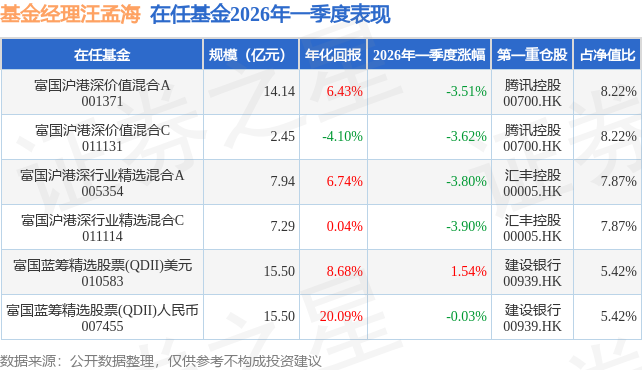 证券之星消息,日前富国沪港深价值混合C基金公布一季报,2026年一季度最新规模2.45亿元,季度净值涨幅为-3.62%。