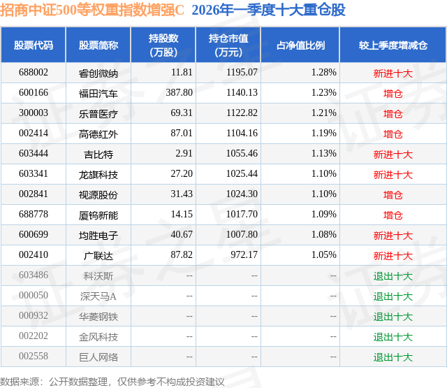 从基金规模来看,招商中证500等权重指数增强C基金2026年一季度公布的基金规模为4.52亿元,较上一期规模3.28亿元变化了1.24亿元,环比变化了37.68%。该基金最新一期资产配置为:股票占净值比92.62%,无债券类资产,现金占净值比7.45%。从基金持仓来看,该基金当季前十大股票仓位达11.46%,第一大重仓股为睿创微纳(688002),持仓占比为1.28%。
