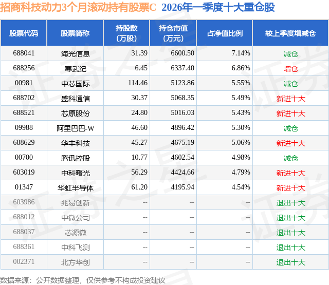 从基金规模来看,招商科技动力3个月滚动持有股票C基金2026年一季度公布的基金规模为1.69亿元,较上一期规模1.44亿元变化了2493.9万元,环比变化了17.36%。该基金最新一期资产配置为:股票占净值比92.93%,债券占净值比5.25%,现金占净值比1.35%。从基金持仓来看,该基金当季前十大股票仓位达55.14%,第一大重仓股为海光信息(688041),持仓占比为7.14%。