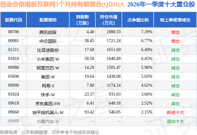 从基金规模来看,创金合信港股互联网3个月持有期混合(QDII)A基金2026年一季度公布的基金规模为1.63亿元,较上一期规模2.45亿元变化了-8144.55万元,环比变化了-33.3%。该基金最新一期资产配置为:股票占净值比82.72%,无债券类资产,现金占净值比14.67%。从基金持仓来看,该基金当季前十大股票仓位达51.6%,第一大重仓股为腾讯控股(00700),持仓占比为7.39%。