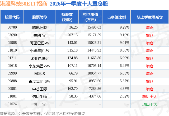 从基金规模来看,港股科技50ETF招商基金2026年一季度公布的基金规模为16.68亿元,较上一期规模14.96亿元变化了1.72亿元,环比变化了11.47%。该基金最新一期资产配置为:股票占净值比99.18%,无债券类资产,现金占净值比1.05%。从基金持仓来看,该基金当季前十大股票仓位达67.86%,第一大重仓股为腾讯控股(00700),持仓占比为9.29%。