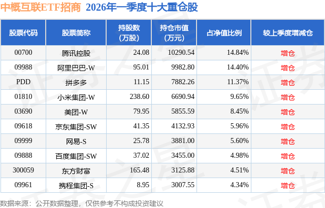 从基金规模来看,中概互联ETF招商基金2026年一季度公布的基金规模为6.93亿元,较上一期规模4.04亿元变化了2.89亿元,环比变化了71.48%。该基金最新一期资产配置为:股票占净值比84.03%,无债券类资产,现金占净值比1.03%。从基金持仓来看,该基金当季前十大股票仓位达84.1%,第一大重仓股为腾讯控股(00700),持仓占比为14.84%。