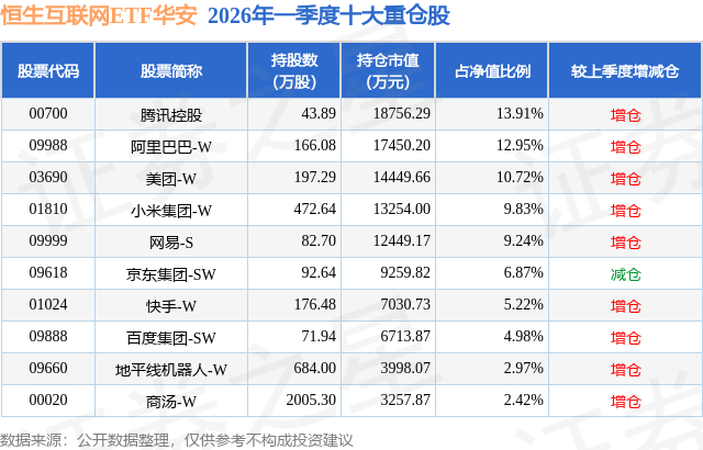 证券之星消息,日前恒生互联网ETF华安基金公布一季报,2026年一季度最新规模13.48亿元,季度净值涨幅为-19.85%。