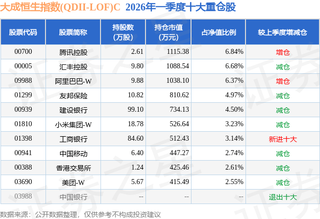 证券之星消息,日前大成恒生指数(QDII-LOF)C基金公布一季报,2026年一季度最新规模0.43亿元,季度净值涨幅为-5.5%。