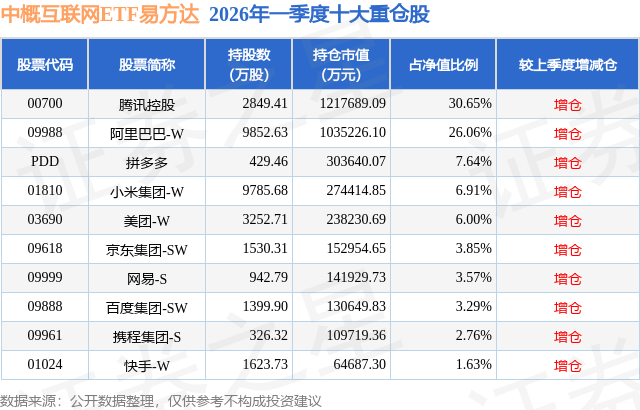 从基金规模来看,中概互联网ETF易方达基金2026年一季度公布的基金规模为397.32亿元,较上一期规模398.59亿元变化了-1.26亿元,环比变化了-0.32%。该基金最新一期资产配置为:股票占净值比88.82%,无债券类资产,现金占净值比1.71%。从基金持仓来看,该基金当季前十大股票仓位达92.36%,第一大重仓股为腾讯控股(00700),持仓占比为30.65%。