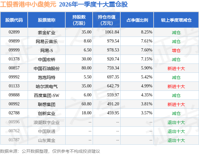 从基金规模来看,工银香港中小盘美元基金2026年一季度公布的基金规模为1.29亿元,较上一期规模1.18亿元变化了1119.29万元,环比变化了9.52%。该基金最新一期资产配置为:股票占净值比84.86%,无债券类资产,现金占净值比20.11%。从基金持仓来看,该基金当季前十大股票仓位达58.65%,第一大重仓股为紫金矿业(02899),持仓占比为8.25%。