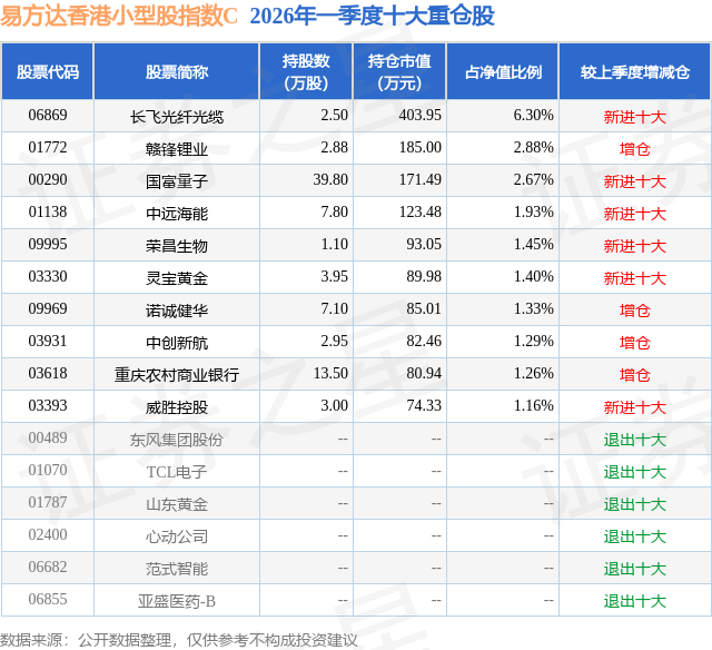 从基金规模来看,易方达香港小型股指数C基金2026年一季度公布的基金规模为0.05亿元,较上一期规模434.28万元变化了100.6万元,环比变化了23.16%。该基金最新一期资产配置为:股票占净值比92.39%,无债券类资产,现金占净值比7.02%。从基金持仓来看,该基金当季前十大股票仓位达21.67%,第一大重仓股为长飞光纤光缆(06869),持仓占比为6.3%。
