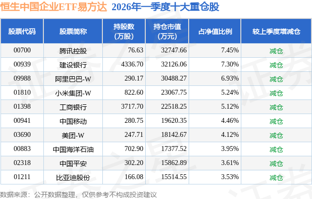 从基金规模来看,恒生中国企业ETF易方达基金2026年一季度公布的基金规模为43.98亿元,较上一期规模78.7亿元变化了-34.72亿元,环比变化了-44.11%。该基金最新一期资产配置为:股票占净值比95.47%,无债券类资产,现金占净值比5.39%。从基金持仓来看,该基金当季前十大股票仓位达51.71%,第一大重仓股为腾讯控股(00700),持仓占比为7.45%。