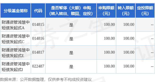 注:(1)根据法律法规和基金合同的相关规定,自2026年04月29日起,财通证券资产管理有限公司(以下简称“本公司”)将调整财通资管鸿慧中短债债券型发起式证券投资基金(以下简称“本基金”)A、C、E、I类份额在除本公司“直销渠道”、“国金证券股份有限公司”以外的其他渠道办理的大额申购(含转换转入、定期定额投资)业务。届时起,若单日单个基金账户单个渠道的单笔申购(含转换转入、定期定额投资)金额超过人民币100元(不含)的,本公司将有权对超过100元的部分予以拒绝。若单日单个基金账户单个渠道多笔累计申购(含转换转入、定期定额投资)金额超过人民币100元的,则对申请按照申请金额从大到小排序,逐笔累加至不超过人民币100元(含)限额的申请确认成功,对超过100元的部分及其余笔数本公司有权予以拒绝。本基金A、C、E、I类份额分别单独判断。
